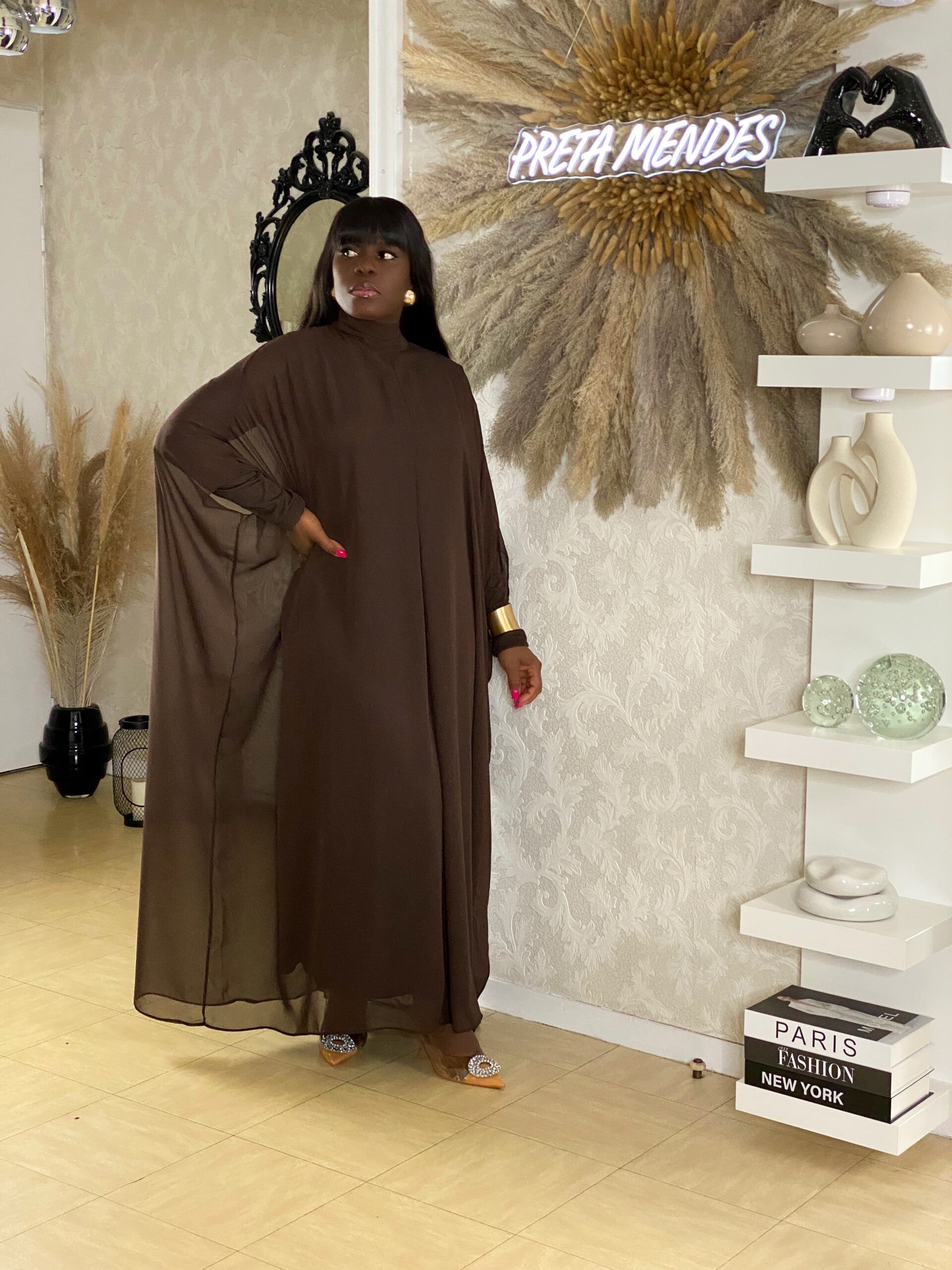 Robe en mousseline à manches chauve-souris - Marron.